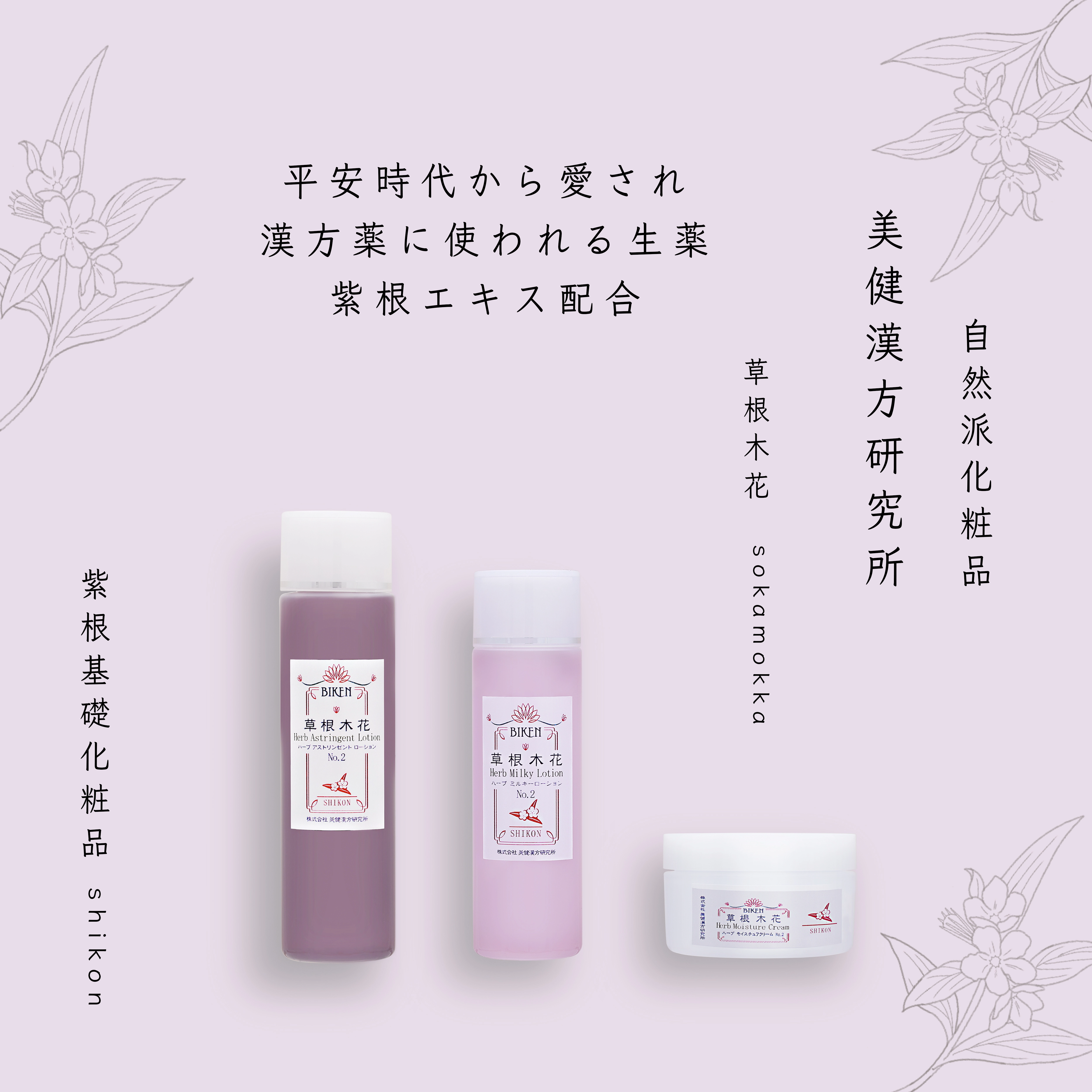 紫根(しこん)は、スキンケア化粧材・保湿剤として、化粧水・乳液・クリーム・美容液など幅広く使われています。